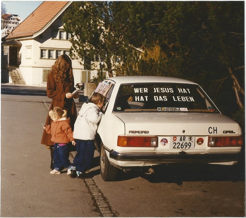 Das war unser Auto während der Bibelschulzeit in Walzenhausen. Bei den Fahrten konnten wir beten, dass die Fahrer hinter oder die Fussgänger den Satz lesen und von Gott zur Umkehr berührt werden.